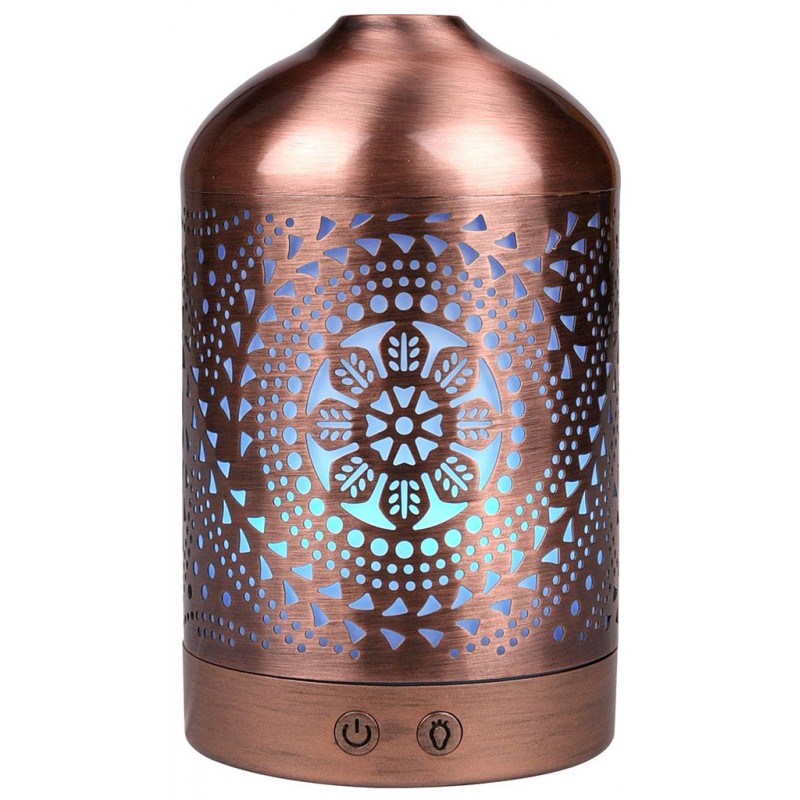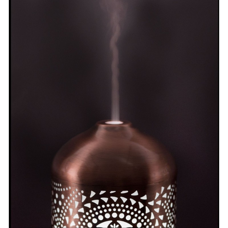CHARAKTERISTIKAZvlhčovač vzduchu s difuzérom v dizajne medené lampy. Aromatizuje a zvlhčuje vzduch kombináciou účinkov vodnej hmly a esenciálnych olejov. Pomocou jemného ultrasonického vlnenia rozkladá esenciálne oleje na extrémne malé mikročastice, bez toho aby ich zahrieval. Oleje si tak zachovávajú pôvodnú vôňu aj liečivé účinky. Aróma difuzér vám pomôže vytvoriť z každej izby voňajúce oázu a navodiť relaxačnú atmosféru. Bez pridania esenciálneho oleja vám aróma difuzér poslúži ako zvlhčovač vzduchu. Pridaním konkrétneho esenciálneho oleja môžete sebe, alebo vašim blízkym pomôcť s rôznymi ťažkosťami. Postačí pár kvapiek kvalitného oleja a môžete uľaviť nádche, kašľu, bolestiam hlavy, alebo zlému zaspávanie. Správne zvolený olej vyčistí vzduch, alebo vám jednoducho spríjemní pobyt v miestnosti, v ktorej sa práve nachádzate. Vďaka štýlovému medenému dizajnu štýlovo doplní vybavenie všetkých obytných priestorov, detských izieb, rokovacích miestností, masážnych salónov, wellness centier apod. Vhodne zvolenými esenciálnymi olejmi môžete podporiť relaxačnú atmosféru v spálni, dezinfekciu vzduchu či pokojný spánok v detskej izbe. Koncentráciu v izbe študenta alebo uvoľnenú komunikáciu, či už doma alebo v pracovnom prostredí. Používajte vždy kvalitné oleje. Použitím lacných, umelých olejov síce vytvoríte voňavé prostredie, ale telo a myseľ si neodpočinú. Citlivým osobám môže naopak uškodiť. Napríklad bolestí hlavy a pod. Počas prevádzky aróma difuzéra možno ľubovoľne a jednoducho nastaviť svetelné efekty, ktoré vytvoria vo vašej izbe veľmi príjemné prostredie a navodí relaxačnú atmosféru. Aróma difuzér je vhodný všade, kde je z bezpečnostných dôvodov nemožné použiť otvorený oheň (sviečky v aróma lampách). Kombinuje účinky vodnej hmly a esenciálnych olejov. Obsluha aróma difuzéra je veľmi jednoduchá. Do zásobníka nalejete vodu, najlepšie destilovanú. Nakvapkať niekoľko kvapiek esenciálneho oleja a prístroj zapnete stlačením tlačidla MIST (hmla). Aróma difuzér začne okamžite vytvárať vodnú hmlu a rozptyľovať olej do vzduchu. Druhým stlačením nastavíte prerušovanou tvorbu hmly a tretím ho vypnete. Pomocou tlačidla LIGHT môžete nastaviť režim farebného podsvietenia. Prvým stlačením nastavíte režim automatickej zmeny farby. Ďalšími stlačeniami môžete nastaviť niekoľko farieb v intenzívnejšie alebo svetlejšie verziu, ktoré zostanú nastavené počas prevádzky prístroja, kým ich nezmeníte. Nemusíte kontrolovať množstvo vody v zásobníku. Po vyprázdnení sa aróma difuzér sám vypne.