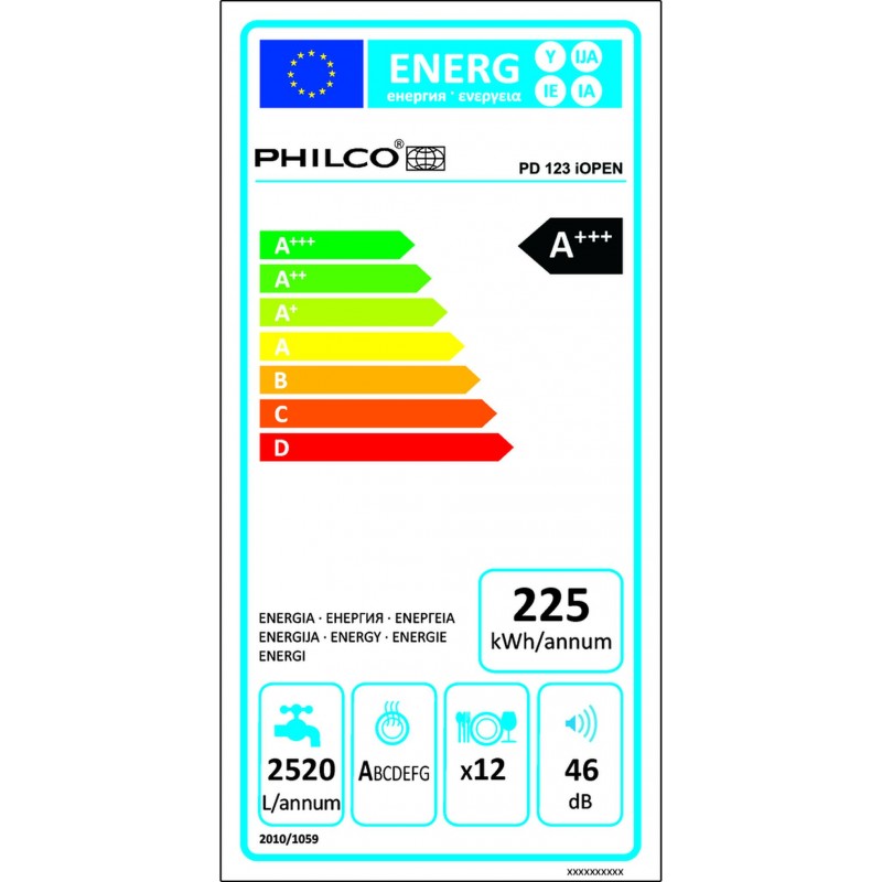 PHILCO PD 123 iOPEN Umývačka riadu 60cm 40035232Umývačka PD123iOPEN sa radí do energetickej triedy A +++ je vybavená funkciou automatického otvárania dverí po dokončení programu,