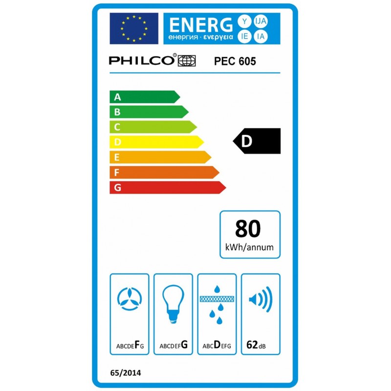PHILCO PEC 605 Komínový odsávač 43001955Nerezový komínový odsávač pár Philco PEC605 s 3 stupňami výkonu a možností použitia režime odsávania režime recirkulácie. Maximálny prietok odsávača PEC605 je 270 m3 / h s hlučnosťou 62 dB. Hliníkové filtre prispôsobené pre umývanie v umývačke. Technické parametre: