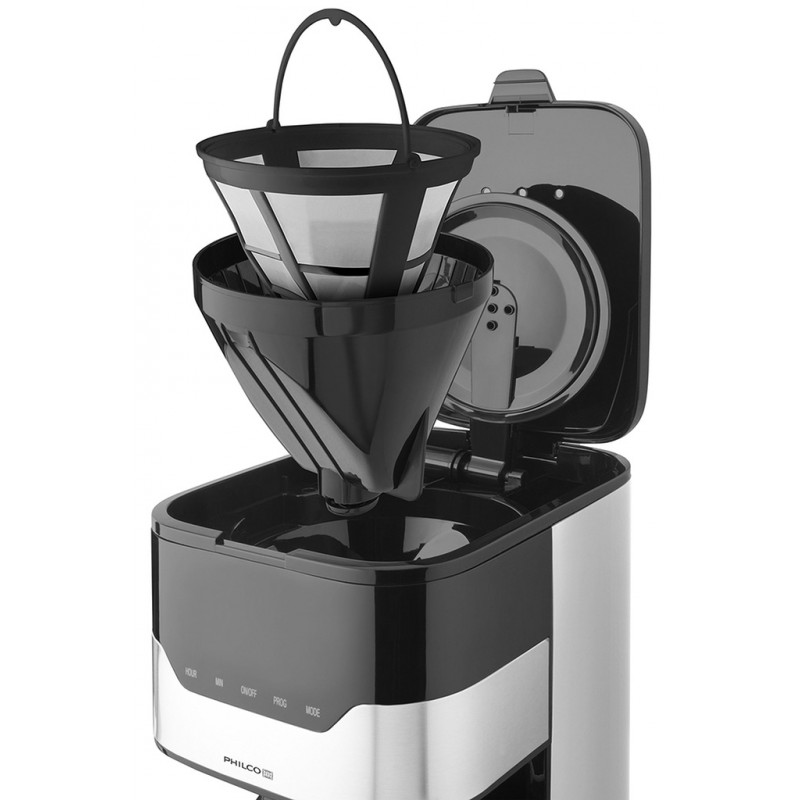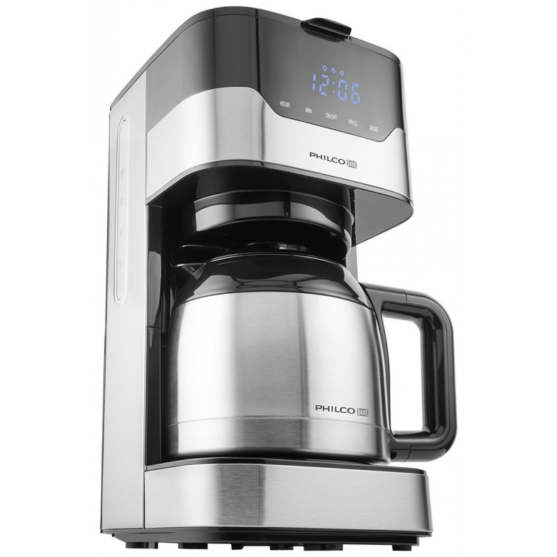 Hlavnou prednosťou kávovaru PHCM 3000 je jeho unikátny dvojstenná termokanvice. Vďaka tej vám vaša káva vydrží čerstvá s plnou chuťou po dlhú dobu. Zároveň Vám ušetrí peniaze za energiu, pretože nemusia zbytočne prihrievať překapanou kávu v kanvici po ukončení jej prípravy. Ďalšou výhodou je jej nerezové kompaktné spracovanie, ktoré bude vyzerať dokonale vo vašej kuchyni aj na pracovisku. S objemom kanvice 1,2 l si budete môcť v pokoji vychutnať až 12 šálok kávy. Kávovar má funkciu Drip-stop pre prerušenie prekvapkať kávy pri vybratej kanvicu. Kontrolovať množstvo vody v kávovare môžete pohodlne cez stupnicu hladiny vody v nádržke. Kanvica má prehľadný LCD displej s programovaním prípravy kávy na 24 hodín. Na prípravu kávy potom môžete vyberať medzi papierovými filtrami (nie sú súčasťou balenia) alebo permanentným filtrom.• Nerezové prevedenie kávovaru