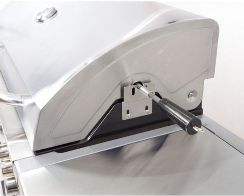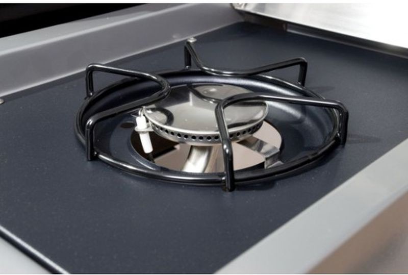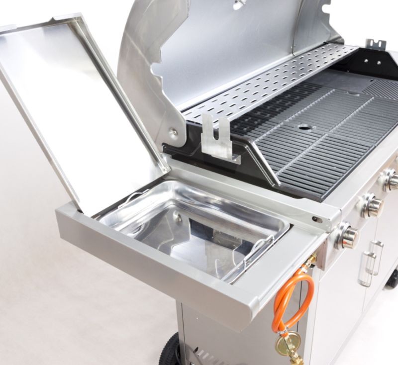 Záhradný plynový gril je opatrený odklápacím krytom grilovacej plochy a odkladacími poličkami na oboch stranách. Pod ľavú odkladacou plochou sa skrýva nádobka, kam môžete odkladať napr. Naložené mäso pripravené na grilovanie. Pod pravou odkladacou plochou sa nachádza bočný horák. Dvierka grilu sú vyrobené z nerezovej ocele.