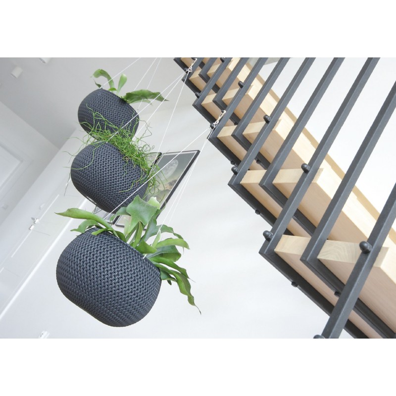 Kvetináč obsahuje vložku pre zasadenie rastliny a nerezový závesný systém s karabínou.