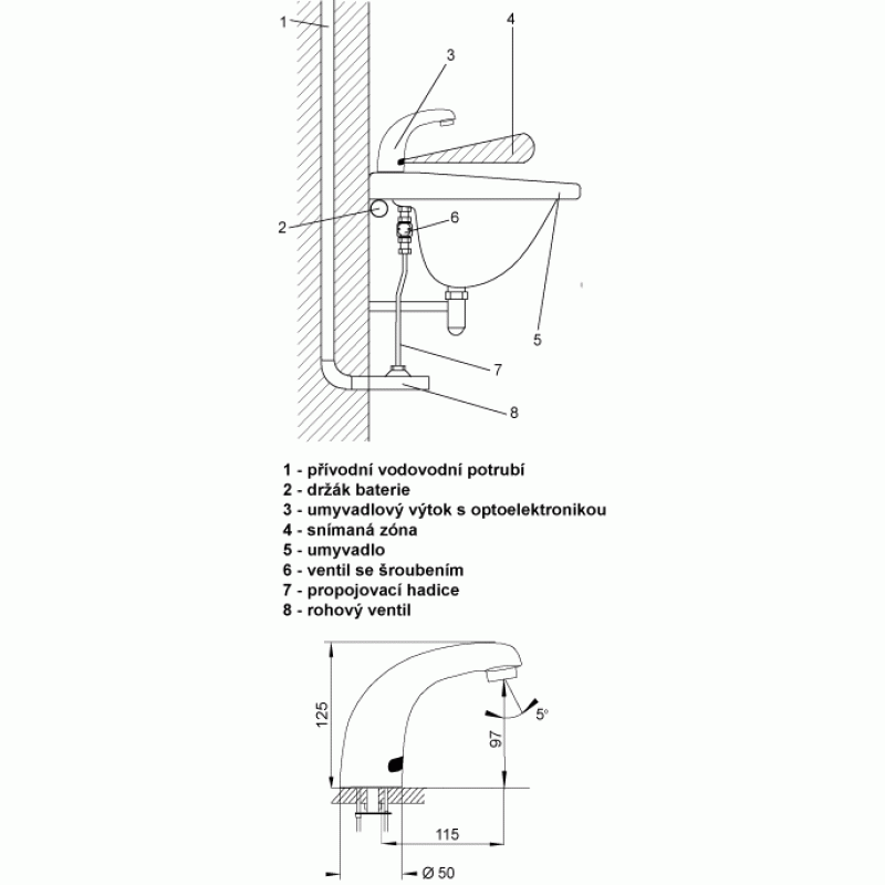 - Reaguje na prítomnosť rúk v snímanej zóne do vzdialenosti 0,3 m od snímača okamžitým spustením vody