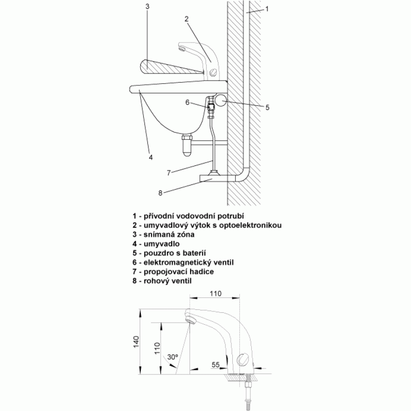 - Reaguje na prítomnosť rúk v snímanej zóne do vzdialenosti 0,3 m od snímača okamžitým spustením vody