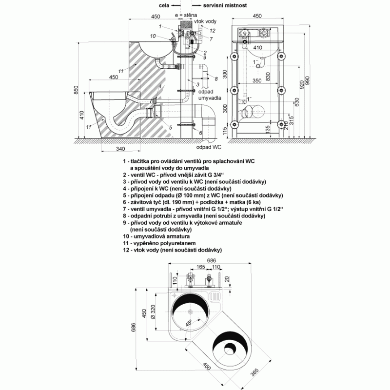 - Pro odeslání do Česka navštivte SANELA WC s umyvadlem do rohu SLWN 08P, WC na zemi vpravo, závitové tyče 94082