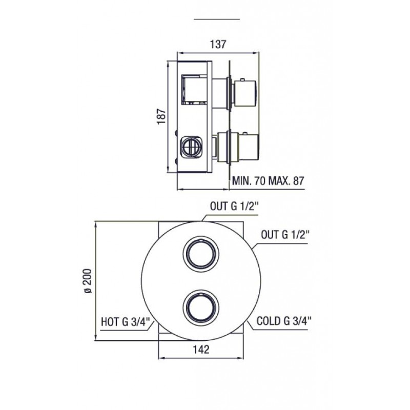 Podomietková termostatická sprchová batéria pre 2 výstupy.