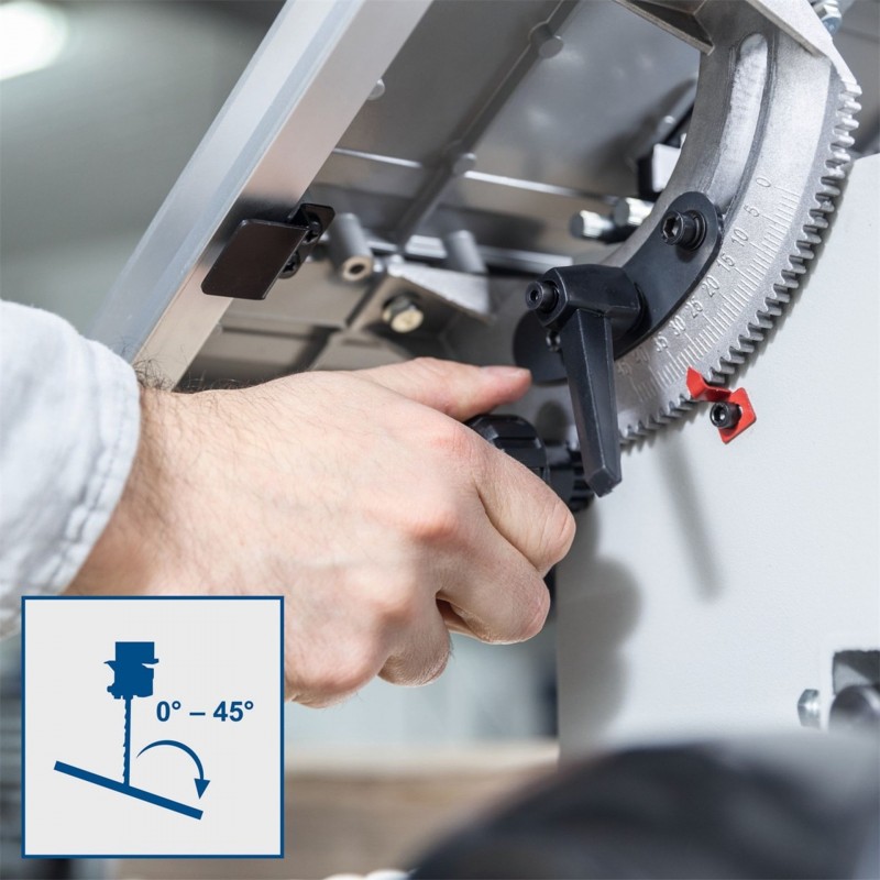 Vďaka dvom rezným rýchlostiam je pásová píla schopná vykonávať čisté a presné rezy v rôznych materiáloch aj v dreve rôznej tvrdosti. Základom stroja je silný a tichý indukčný motor s bezuhlíkovou technológiou, ktorý zaručuje spoľahlivý chod a dlhú životnosť. Pracovný stôl je naklápací v rozsahu 0° až 45°, má možnosť predĺženia a je vyrobený z odolnej hliníkovej zliatiny. Vo výbave nechýba pevné posuvné pravítko s rýchloupínaním ani presné uhlové pravítko. Zvyšok konštrukcie pásovej píly je celokovový.