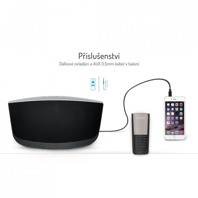 Príslušenstvo: diaľkové ovládanie (batéria CR2032 pribalená), 3,5mm AUX kábel, návod