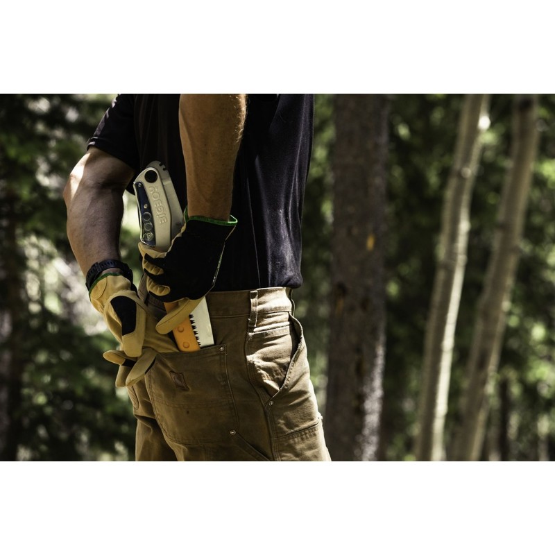 Pílu je možné jednoducho zložiť a rozložiť pomocou aretačného tlačidla, ktoré zároveň umožňuje nastaviť 2 rôzne polohy rezania. Gumová rukoväť zaisťuje bezpečný a pohodlný úchop a je dostatočne veľká na to, aby ste mohli pílu používať oboma rukami. Pre väčšiu praktickosť je v rukoväti otvor, ktorý umožňuje k píle pripevniť karabínu alebo lano.