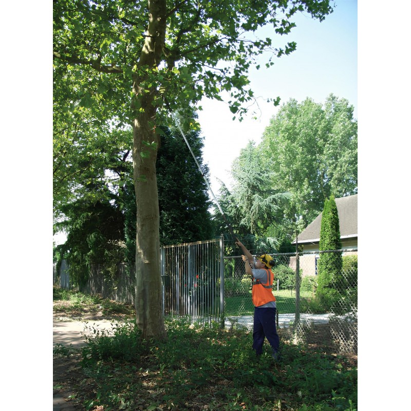 Hliníková násada s oválnym tvarom poskytuje presnú kontrolu smeru rezu a zároveň zvyšuje tuhosť a pevnosť celej píly, čím minimalizuje ohýbanie. Pri plnom rozložení dosahuje maximálnu dĺžku 4,9 metra. Dva zaisťovacie mechanizmy (tlačidlá a páky) zabezpečujú bezpečné a stabilné nastavenie dĺžky. Spodná časť násady je vybavená gumovou rukoväťou pre pohodlný a bezpečný úchop aj za mokra.