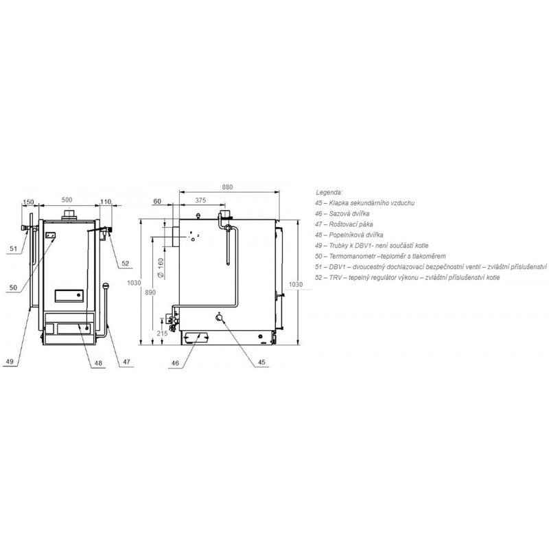 Regulácia sekundárneho vzduchu privádzaného do spaľovacej komory zvyšuje účinnosť kotla. Primárny vzduch je privádzaný pod rošt regulovateľnou klapkou v popolníkových dvierkach. Regulácia sa vykonáva ručne alebo automatickým regulátorom, ktorý je súčasťou ceny kotla. Vstup a výstup vykurovacej vody je opatrený prírubami DN 65. Dymovod je v osi kotla na zadnej strane. Zatápacou klapka sa ovláda z boku kotla. Sadzové otvory pre čistenie kotly sú na kotle umiestnené z oboch strán.