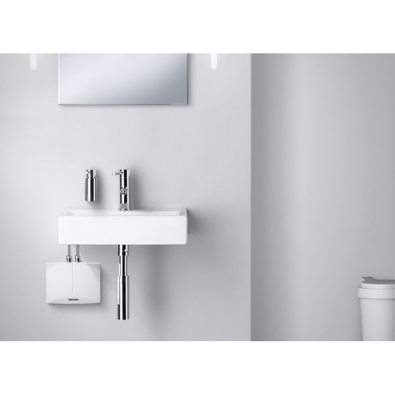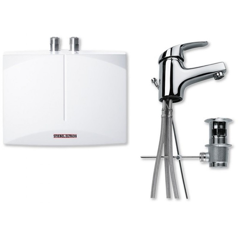Stiebel Eltron DNM 3 + MAE beztlak. prietokový ohrievač 3,5 kW s pákovou batériou 185414Set malého hydraulicky riadeného elektrického prietokového ohrievača vody DNM 3 s výkonom 3,5 kW a pákovou umývadlovou beztlakovou batériou MAE vhodného na zásobovanie teplej vody pre umývadla na umývanie rúk s umiestnením pod umývadlo od výrobcu Stiebel Eltron.