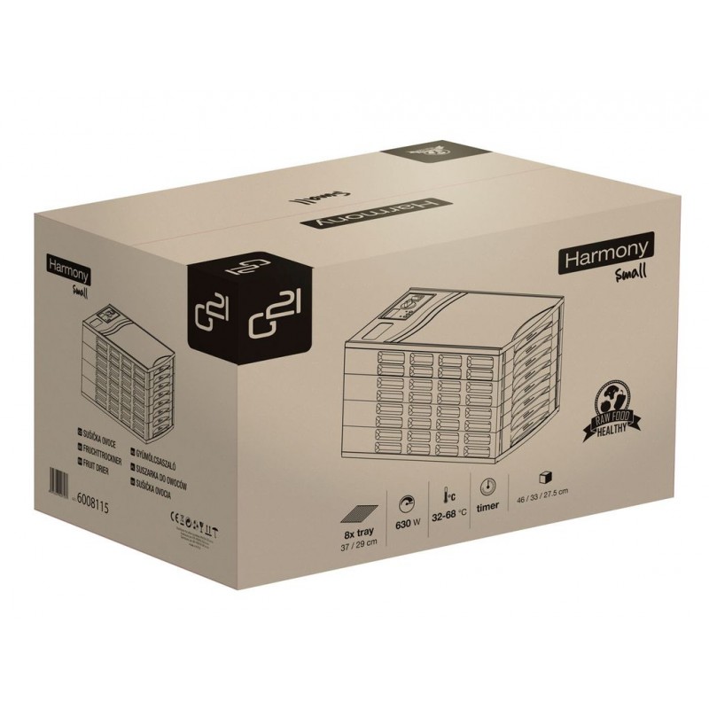 Sušička G21 Harmony small zaručuje rýchle a rovnomerné sušenie všetkých kúskov potravín, pretože je vybavená sušiacim systémom využívajúcim horizontálne prúdenie vzduchu a termostatom pre správne nastavenie teploty. Disponuje regulátorom nastavenia teploty, digitálnym časovačom a digitálnym displejom.