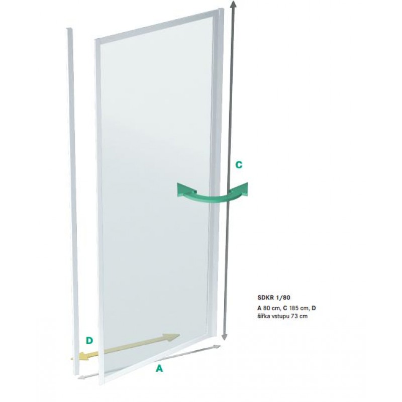 Spojením zodpovedajúcich pevných a pohyblivých stien pomocou pojazdov s kladkou a kĺbom, a príslušného tesnenia je dosiahnuté výrobkov v ponúkaných rozmeroch. Štandardná výška sprchových dverí SDKR 1/80 je 185 cm. Tenkostenné profily sú vyrobené z vysoko pevnostnej zliatiny hliníka, povrchová úprava práškovým nástrekom komaxit bielej farby.