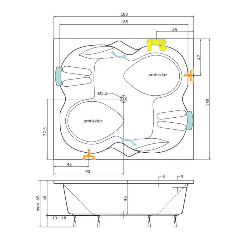 TEIKO Vaňa Athina hydromasážne 180 x 155 cm - HTP systém BASIC V217185N04T01011Rozmery: 180 x 155 x 46 cm