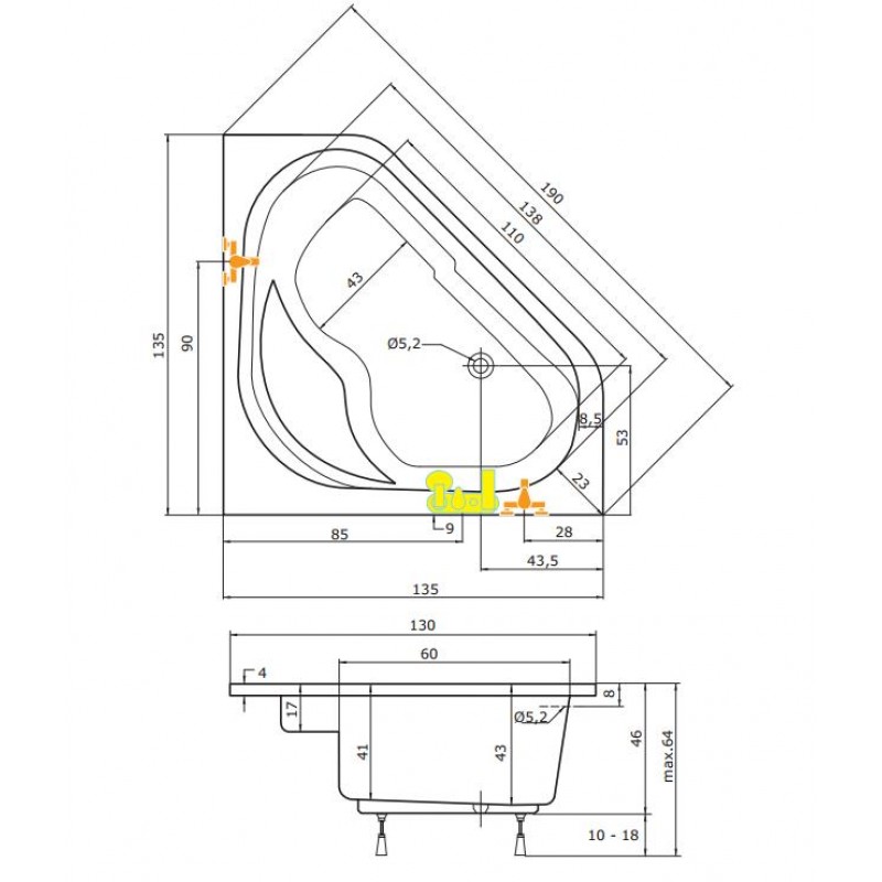 TEIKO Vaňa Capri rohová 135x135 cm - HTP systém ECO HYDRO V211135N04T03211Rozmery: 135 x 135 x 43 cm