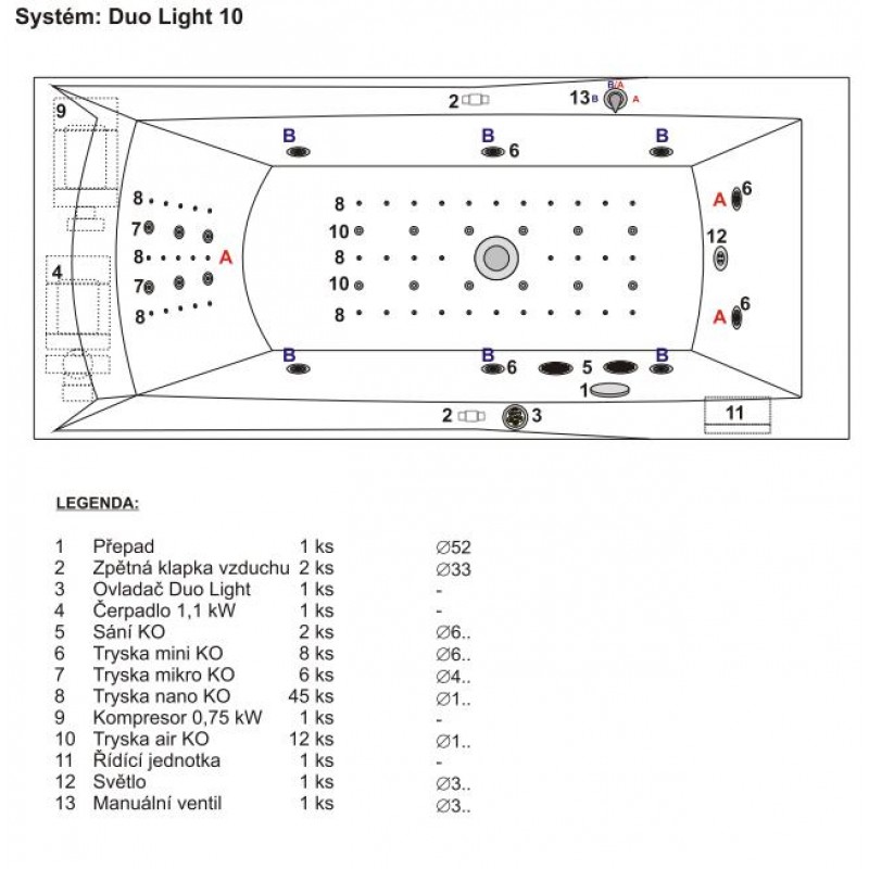 Vzduchové trysky - privádza vzduch zdmychadla pre povrchovú relaxačnú masáž. Sú inštalované do nôh.