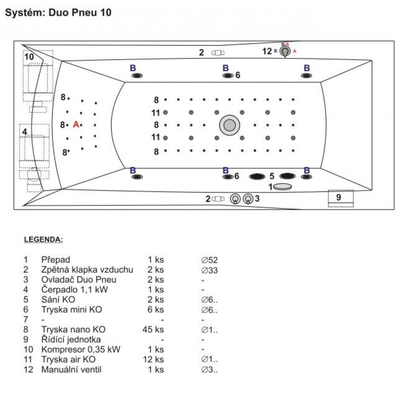 Vzduchové trysky - privádza vzduch zdmychadla pre povrchovú relaxačnú masáž. Sú inštalované do nôh.