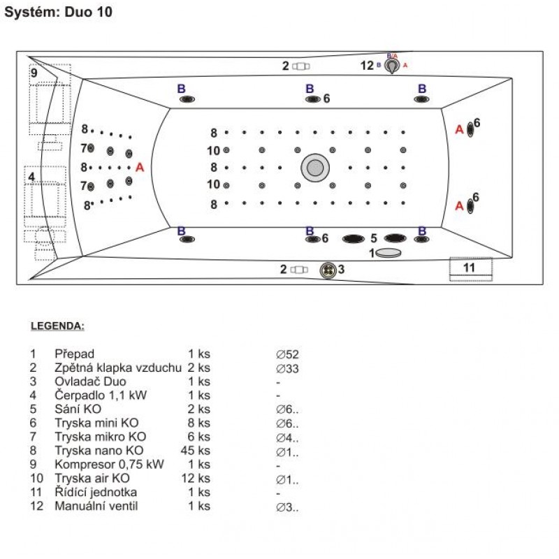 Vzduchové trysky - privádza vzduch zdmychadla pre povrchovú relaxačnú masáž. Sú inštalované do nôh.