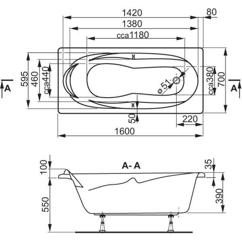 Anatomická vaňa s prelismi na stranách, ktoré udržujú Vaše paže pri kúpaní v prirodzenej a veľmi príjemnej polohe.