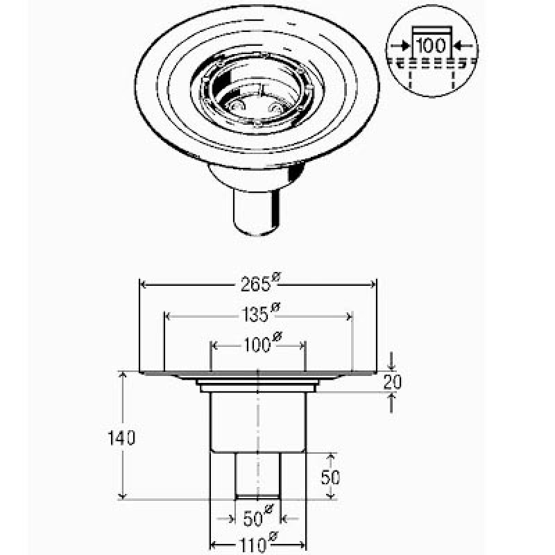 utesňovacie príruba , zátka , otočný a výškovo nastaviteľný nadstavec 100x100 mm , rám z plastu , rošt z nerezu 1.4301 ,