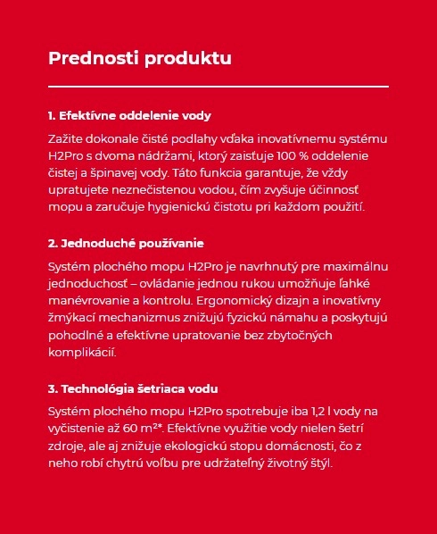 Zažite revolučný systém plochého mopu H2Pro, ktorý vďaka 100 % oddeleniu čistej a špinavej vody, technológii šetriacej vodu a pokročilým mikrovláknam zaistí dokonale čisté podlahy a efektívne upratovanie.