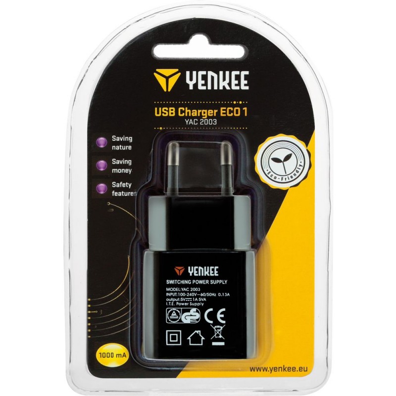 YENKEE YAC 2003BK USB Nabíjačka 1000 mA 45007865Sieťová nabíjačka s USB výstupom. Zahŕňa niekoľko bezpečnostných funkcií, ako ochranu proti skratu alebo automatické vypnutie pri preťažení. Dokonalý spoločník na cesty.