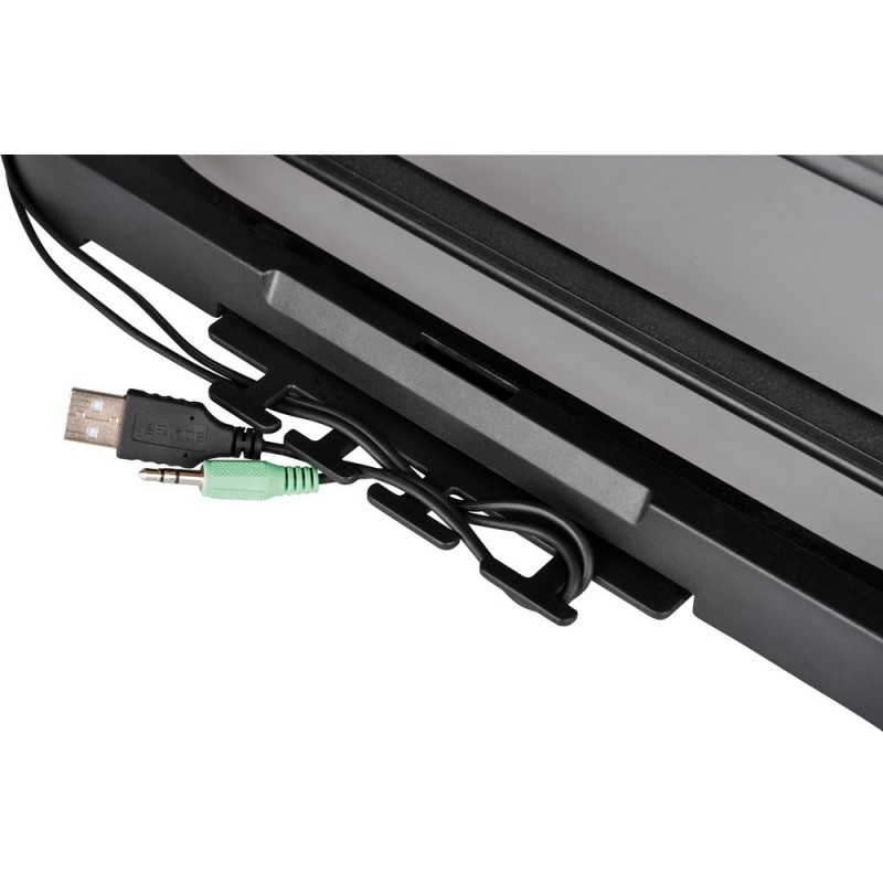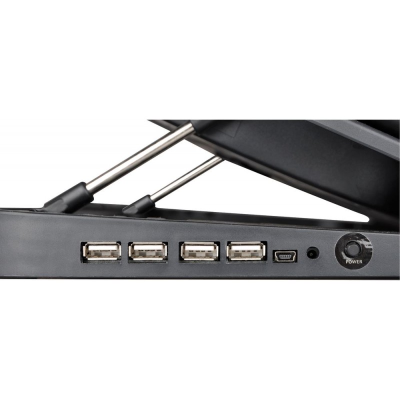 Regulovateľná výška (6 aretovaných polôh) umožňuje nastavenie požadovaného zorného uhla. Optimálny odvod tepla od notebooku zaisťuje výkonný ventilátor s možnosťou vypnutia a nastavenie do ideálnej polohy s ohľadom na typ a veľkosť notebooku (možnosť horizontálneho posúvania ventilátora cca. 7cm vľavo a vpravo od stredu podložky). Podložka obsahuje 4portový húb USB 2.0 a praktický držiak káblov na zadnej strane (s možnosti schovaní ak nepoužívate). Vhodné pre všetky notebooky do 15 ".