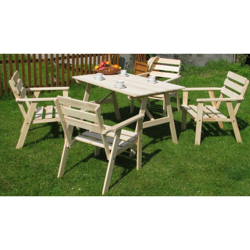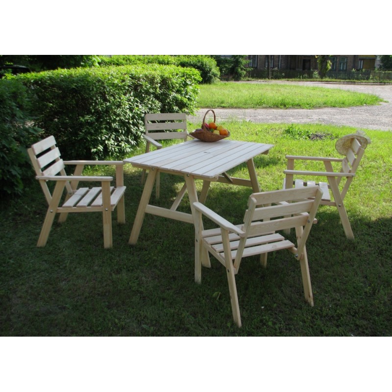 Záhradný drevený set z prírodnej borovice - stôl a štyri kresielka. Borovicové drevo nie je povrchovo upravené. Použité kovové časti (skrutky, matice alebo kovania) sú vyrobené z nerezovej ocele.Možné dokúpiť polstrovanie ktoré farebne rozjasnia set a zároveň vám umožní príjemnejšie posedenie.